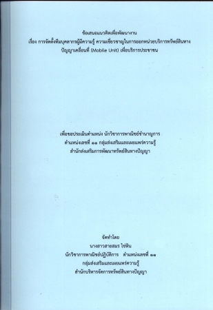ผลงานวิชาการ เรื่อง การจัดตั้งทีมบุคลากรผู้มีความรู้ ความเชี่ยวชาญในการออกหน่วยบริการทรัพย์สินทางปัญญาเคลื่อนที่ (Mobile Unit) เพื่อบริการประชาชน