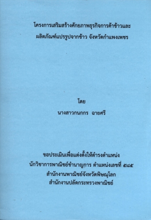 | PB000486 | ผลงานวิชาการ เรื่อง โครงการเสริมสร้างศักยภาพธุรกิจการค้าข้าวและผลิตภัณฑ์แปรรูปจากข้าว จังหวัดกำแพงเพชร | อยู่บนชั้นวางหนังสือ | เข้าสู่ระบบ |