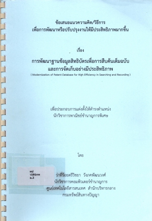 | 01571 | ผลงานวิชาการ เรื่อง การพัฒนาฐานข้อมูลสิทธิบัตรเพื่อการสืบค้นเต็มฉบับและการจัดเก็บอย่างมีประสิทธิภาพ ( Modernization of Patent Database for High Efficiency in Searching and Recording) | อยู่บนชั้นวางหนังสือ | เข้าสู่ระบบ |