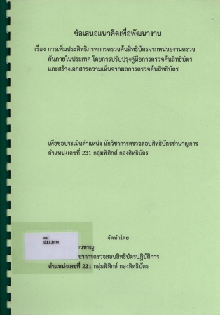ผลงานวิชาการ เรื่อง การเพิ่มประสิทธิภาพการตรวจค้นสิทธิบัตรจากหน่วยงานตรวจค้นภายในประเทศ โดยการปรับปรุงคู่มือการตรวจค้นสิทธิบัตรและสร้างเอกสารความเห็นจากผลการตรวจค้นสิทธิบัตร