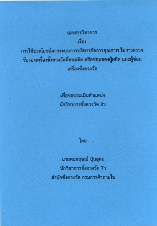 ผลงานวิชาการ เรื่อง การใช้ประโยชน์จากระบบการบริหารจัดการคุณภาพ ในการตรวจรับรองเครื่องชั่งตวงวัดที่ตนผลิต หรือซ่อมของผู้ผลิต และผู้ซ่อมเครื่องชั่งตวงวัด