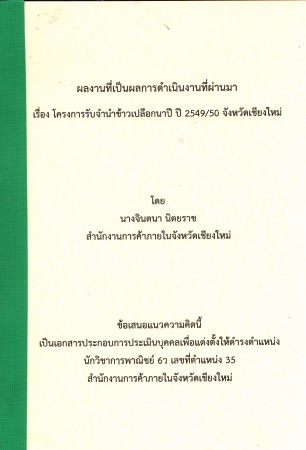 ผลงานวิชาการ เรื่อง โครงการรับจำนำข้าวเปลือกนาปี ปี 2549/50 จังหวัดเชียงใหม่