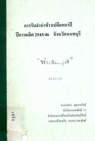 ผลงานวิชาการ เรื่อง การรับจำนำข้าวเปลือกนาปี ปีการผลิต 2545/46 จังหวัดนนทบุรี