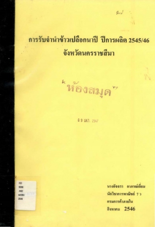 ผลงานวิชาการ เรื่อง การรับจำนำข้าวเปลือกนาปี ปีการผลิต 2545/46 จังหวัดนครราชสีมา