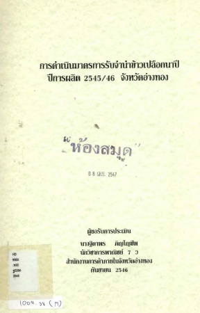 ผลงานวิชาการ เรื่อง การดำเนินมาตรการรับจำนำข้าวเปลือกนาปี ปีการผลิต 2545/46 จังหวัดอ่างทอง