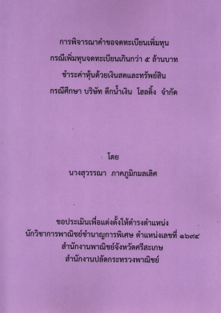 | PB003056 | ผลงานวิชาการ เรื่อง การพิจารณาคำขอจพทะเบียนเพิ่มทุน กรณีเพิ่มทุนจดทะเบียนเกินกว่า 5 ล้านบาท ชำระค่าหุ้นด้วยเงินสดและทรัพย์สิน กรณีศึกษา บริษัท ตึกน้ำเงิน โฮลดิ้ง จำกัด | อยู่บนชั้นวางหนังสือ | เข้าสู่ระบบ |