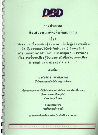 | PB003563 | ผลงานวิชาการ เรื่อง จัดทำระบบขึ้นทะเบียนผู้รับรองลายชื่อผู้ขอจดทะเบียนห้างหุ้นส่วนและบริษัทจำกัดผ่านทางอิเล็กทรอนิกส์พร้อมออกประกาศสำนักงานทะเบียนหุ้นส่วนบริษัทกลางเรื่อง การขึ้นทะเบียนผู้รับรองลายมือชื่อผู้ขอจดทะเบียนห้างหุ้นส่วนและบริษัทจำกัด พ.ศ.... | อยู่บนชั้นวางหนังสือ | เข้าสู่ระบบ |