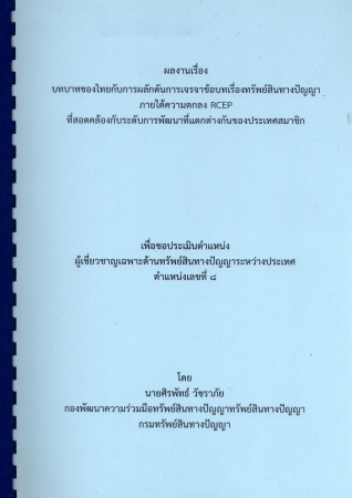 ผลงานวิชาการ เรื่อง บทบาทของไทยกับการผลักดันการเจรจาข้อบทเรื่องทรัพย์สินทางปัญญาภายใต้ความตกลง RCEP ที่สอดคล้องกับระดับการพัฒนาที่แตกต่างกันของประเทศสมาชิก