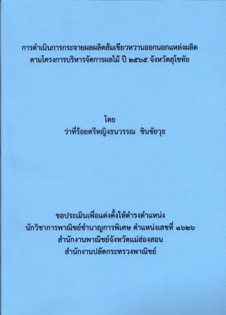 | PB004474 | ผลงานวิชาการ เรื่อง การดำเนินการกระจายผลผลิตส้มเขียวหวานออกนอกแหล่งผลิตตามโครงการบริหารจัดการผลไม้ ปี 2565 จังหวัดสุโขทัย | อยู่บนชั้นวางหนังสือ | เข้าสู่ระบบ |