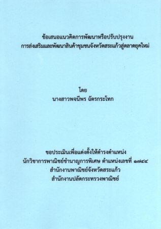 | PB005042 | ผลงานวิชาการ เรื่อง การส่งเสริมและพัฒนาสินค้าชุมชนจังหวัดสระแก้วสู่ตลาดยุคใหม่ | อยู่บนชั้นวางหนังสือ | เข้าสู่ระบบ |